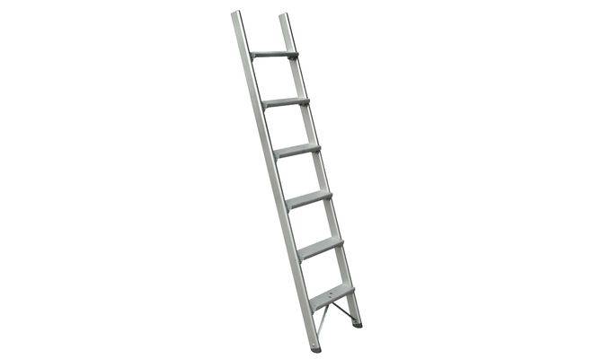 Розсувна драбина для складових приміщень та майстерень. Лонжерони драбини виготовлені з анодованого алюмінію сріблястого кольору, сходинки виготовлені з букового дерева з нековзким покриттям сірого кольору. Монтаж виконується шляхом навішування.