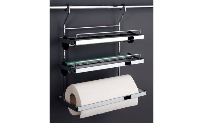 Навісний, 3-поверховий тримач для рулонів, з пристосуванням для відрізання алюмінієвої та поліетиленової плівки. Тримач виготовлений з хромованої сталі з матовою поверхнею. Розміри тримача: ширина 325, мм, глибина 155 мм, висота 390 мм.