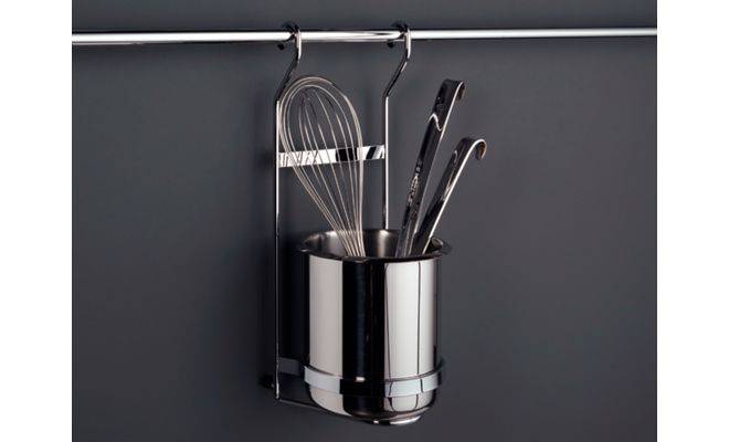 Навісний тримач з 1 циліндричною ємністю для столових приборів, виготовлений з хромованої сталі з полірованою поверхнею. Розміри тримача: ширина 145 мм, глибина 150 мм, висота 360 мм.