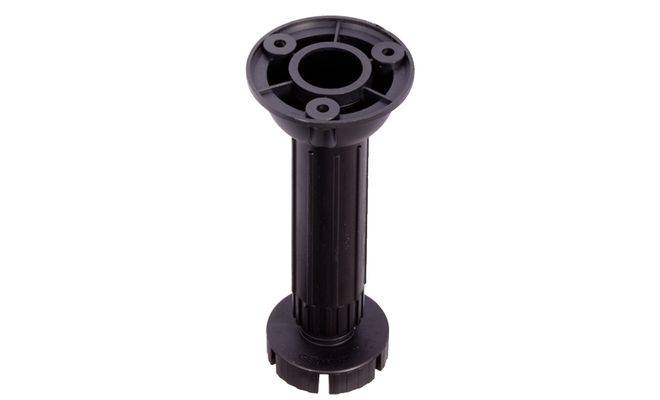 Цокольна меблева опора для кухонних шаф 637.17.302. Вантажопідйомність: близько 160 кг. Матеріал: пластик. Колір: чорний. Розміри опори меблевого плінтуса: Висота: 80 мм. Регулювання висоти: + 15 мм. Діаметр кріплення: 60 мм. Діаметр основи: 50 мм. Діаметр ніжки: 29 мм. Монтаж опори меблевого плінтуса: Шляхом закручування з 3 шурупами для ДСП.
