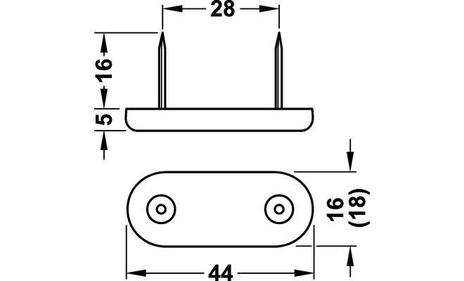 Меблевий підп'ятник, висота 5 мм, пластик, для забивання, розміри (Д x Ш) 44 x 16 мм. Висота установки 5 мм, Довжина шпильки 16.0 мм. Версія з 2 цвяхами. Матеріал: Пластик. Встановлення: Для забивання