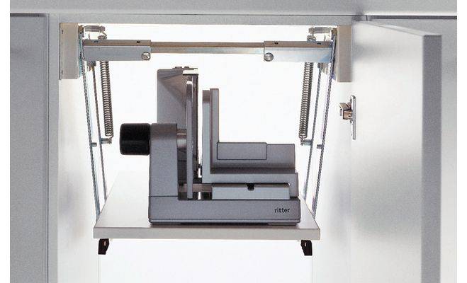 Поворотна фурнітура з 4 пружинами для кухонних шаф, виготовлена зі сталі з пластиковим покриттям білого кольору. Несуча здатність складної фурнітури 10 кг, монтажна ширина 410-570 мм, монтажна висота 505 мм, глибина відкидання 468 мм, корисна висота 240 мм. Монтаж поворотної фурнітури виконується шляхом пригвинчування до бокової стінки.
