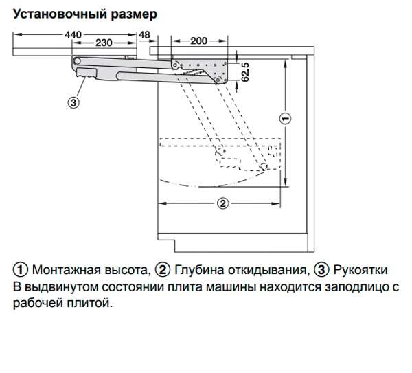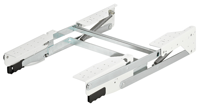Поворотна фурнітура з 2 пружинами для кухонних шаф, виготовлена зі сталі з пластиковим покриттям білого кольору. Несуча здатність складної фурнітури 8 кг, для шафи мін. шириною 450 мм, монтажна ширина від 375 мм, монтажна висота 455 мм, глибина відкидання 495 мм, корисна висота 264 мм. Монтаж поворотної фурнітури виконується шляхом пригвинчування під верхнім щитом корпусу.