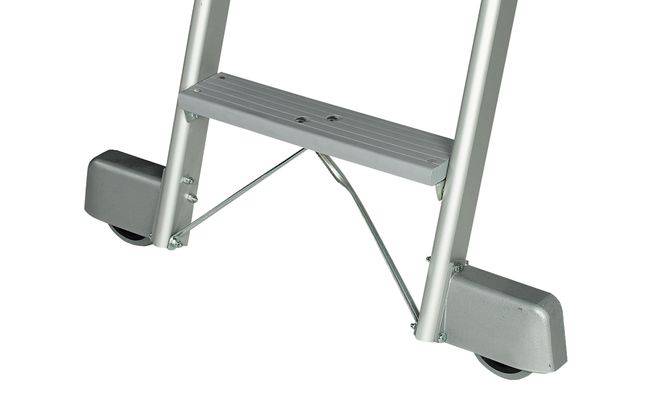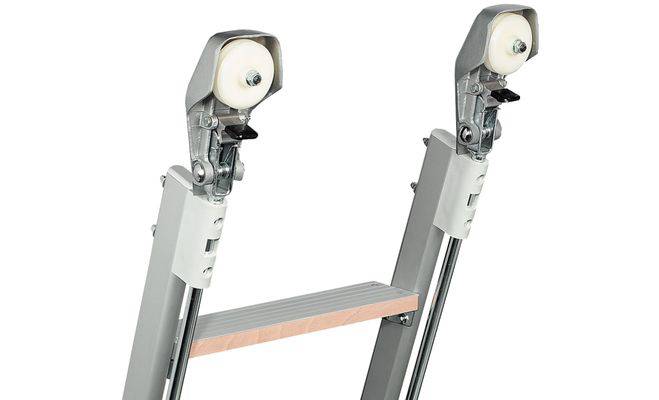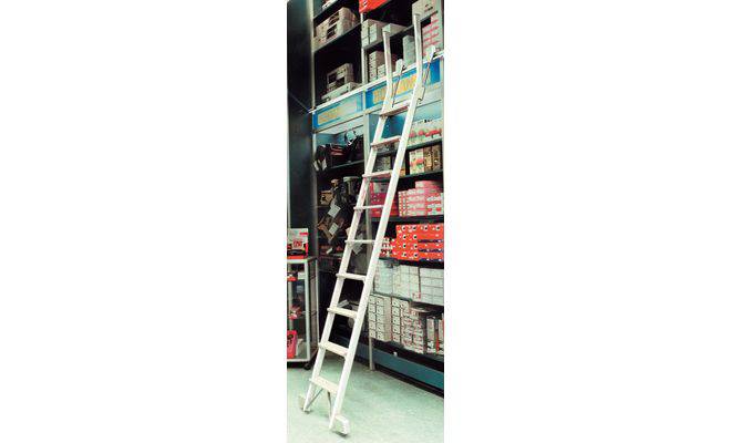 Пересувна драбина для складових приміщень та майстерень. Лонжерони драбини виготовлені з анодованого алюмінію сріблястого кольору, сходинки виготовлені з букового дерева з нековзким покриттям сірого кольору. Максимальне навантаження драбини до 150 кг, ширина 410 мм. При навантаженні драбина гальмується зверху і знизу.