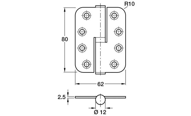 Технічні характеристики Петля карточна ліва латунь 80х62мм D 12 х 7 мм товщина: 2.5 мм 92620580