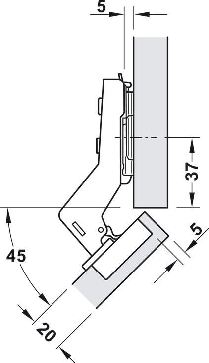 Петля меблева Häfele Metalla 310 A/SM, 45° (арт. 311.83.904). Петля для дерев’яних дверей під кутом 45°. Призначення – для кутових застосувань. Матеріал – сталь, покриття нікельоване. Монтаж – під шуруп, система Aufschiebe-Technik A або швидкий монтаж SM. Регулювання – 3D (бічне, по висоті, по глибині). Кут відкривання – 45°. Глибина свердління під чашку – 12 мм.