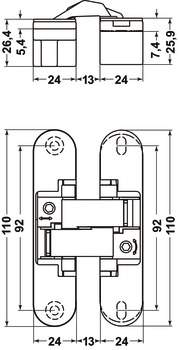 Прихована петля Hafele AN140 3D, для внутрішніх безфальцевих дверей, бронзована (арт. 927.56.111). Прихована петля для дерев’яних коробок і міжкімнатних безфальцевих дверей. Підходить для лівого та правого відкривання (DIN). Витримує навантаження до 40 кг на 2 петлі. Розмір стулки: висота 110 мм, ширина 24 мм. Кут відкривання – 180°. Для дверей товщиною від 32 мм. Матеріал – сплав цинку (Zamak) та ацеталь. Покриття – бронзоване, анодоване. Регулювання у 3 площинах: глибина ±1,5 мм, висота –2,5/+2,5 мм.