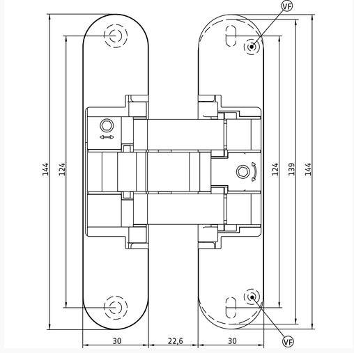 Особливості продукту_x000D_ ФВЗ = обшивка втопленого каркаса_x000D_ Обшивка втопленої рами до 14,0 мм_x000D_ Товщина дверей 40 мм_x000D_ Повністю прихована система петель_x000D_ для дерев'яних рам_x000D_ для житлових приміщень без ремонту_x000D_ Регульований 3D (сторона +/- 1,5 мм, висота +/- 2,5 мм, стиснення +/- 1,0 мм)_x000D_ Централізована установка_x000D_ Матеріал: Tsamac / Acetal_x000D_ _x000D_Технічна інформація_x000D_ Вантажопідйомність 40,0 кг_x000D_ Загальна довжина 144,0 мм_x000D_ Ширина (дверна частина) 30.0 мм_x000D_ Ширина (частина рамки) 30.0 мм_x000D_ Діаметр фрези 14,0 або 16,0 мм_x000D_ Кільце воріт діаметром 25,0 або 27,0 мм_x000D_ Кут відкриття 180°