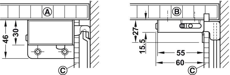 Підвіс для шаф виготовлений з нікельованої сталі, має здатність до регулювання по висоті 16 мм, регулювання глибини 15 мм та бічного регулювання 10 мм. Несуча здатність підвісу - 200 кг на пару. Підвіс для шаф для правостороннього кріплення.