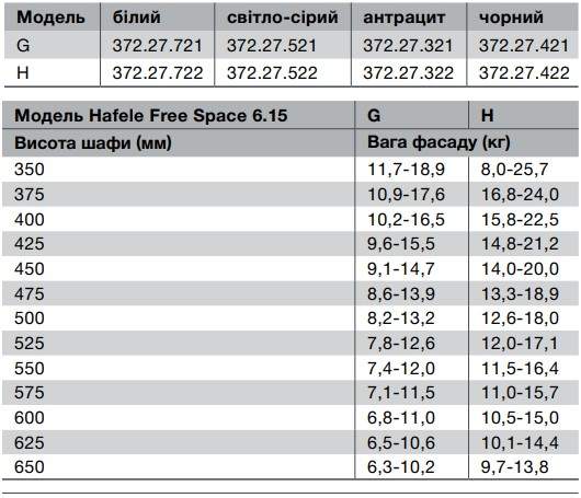 Вказівки для замовлення: Вибір підйомного механізму FreeSpace 6.15 по здатності навантаження залежить від висоти корпусу і ваги фасаду, включаючи лицьову фурнітуру. Для коректного підбору моделі, будь ласка, використовуйте таблицю вимірювальних величин. (Див. Таблицю)