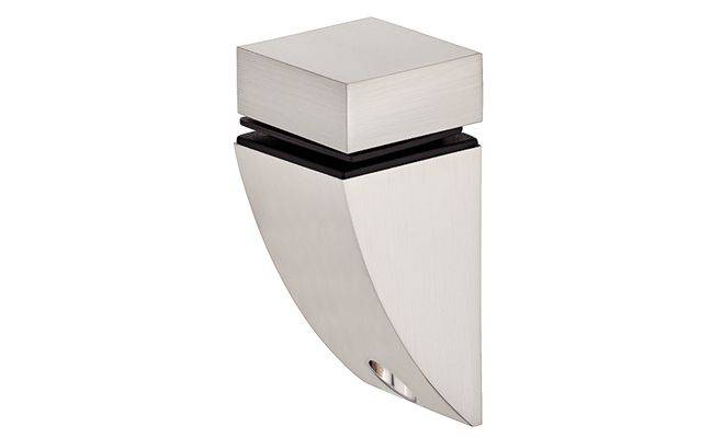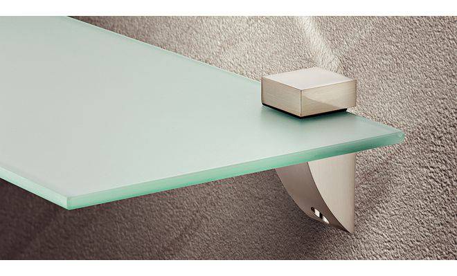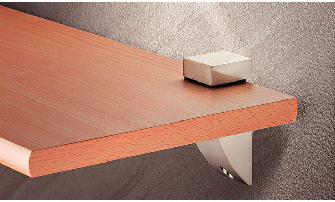 Дизайн-затискний полицетримач для дерева і скла, матеріал: цинкове лиття, кольору нержавіючої сталі, розмір: 35x35 x575 мм, для полиць товщиною 4–24 мм, для вкручування в отвір діаметром 5 мм.