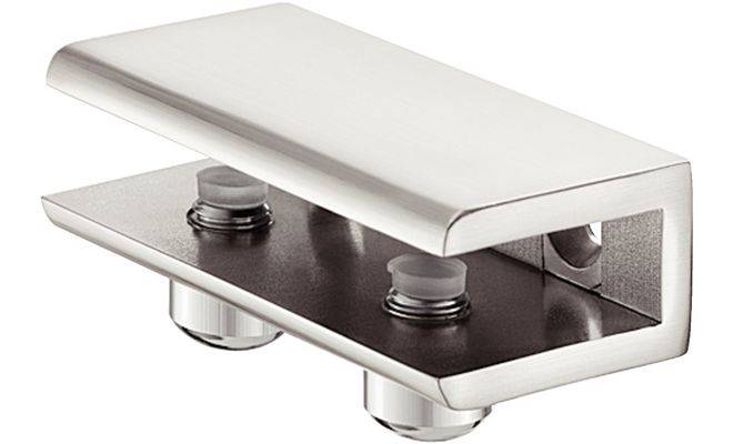 Дизайн-затискний полицетримач для дерева і скла, матеріал: цинкове лиття, хромований, полірований, розмір: 59x30x18 мм, для полиць товщиною 8–10 мм, для вкручування в отвір діаметром 4 мм.