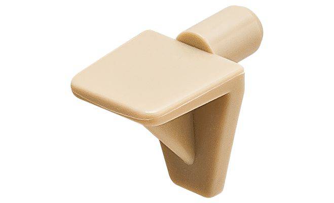 Полицетримач для дерев'яних і скляних полиць, матеріал: пластик, колір: бежевий, для вставляння в отвір діаметром 5 мм, максимальне навантаження 75 кг.