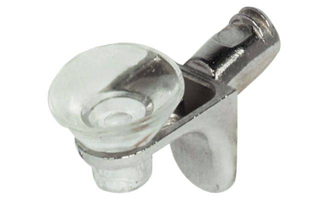 Полицетримач для скляних полиць, з широкою опорою, матеріал: цинкове лиття з пластиковою опорою, нікельований, з двома клиновими носиками, для свердлового отвору діаметром 5 мм.
