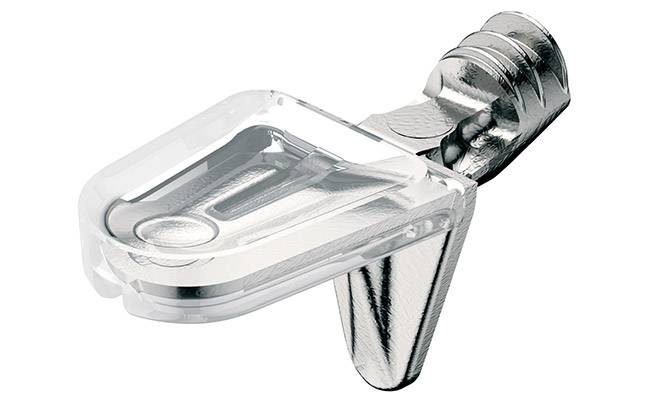 Полицетримач для скляних полиць для кріплення в отворі діаметром 5 мм. Витримує навантаження до 3,1 кг.