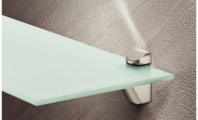 Дизайн-затискний полицетримач для дерева і скла, матеріал: цинкове лиття, хромований, полірований, розмір: 25x40 x41 мм, для полиць товщиною 4–25 мм, для вкручування в отвір діаметром 4 мм.
