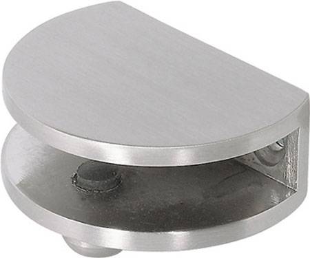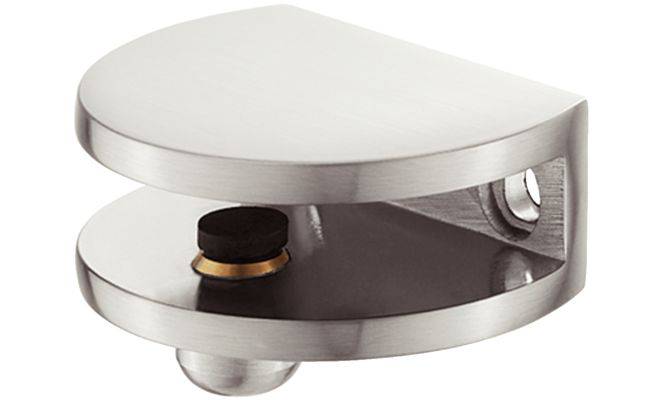Дизайн-затискний полицетримач для дерева і скла, матеріал: цинкове лиття, хромований, полірований, розмір: 49 x36 x16 мм, для полиць товщиною 6-10 мм, для вкручування в отвір діаметром 3.5 мм.