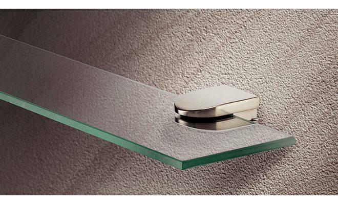 Дизайн-затискний полицетримач для дерева і скла, матеріал: цинкове лиття, кольору нержавіючої сталі, розмір: 55x55x25 мм, для полиць товщиною 8-10 мм, для вкручування в отвір діаметром 5 мм.