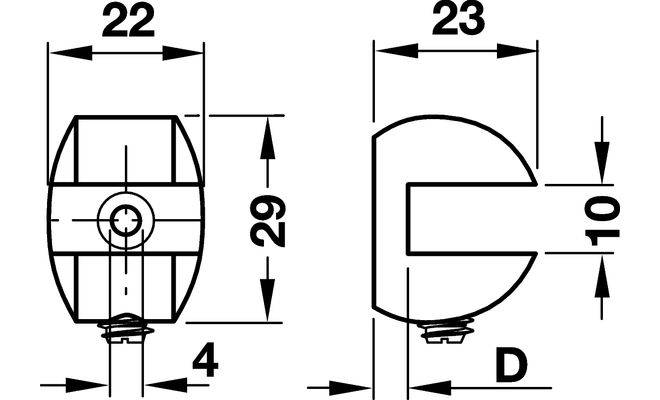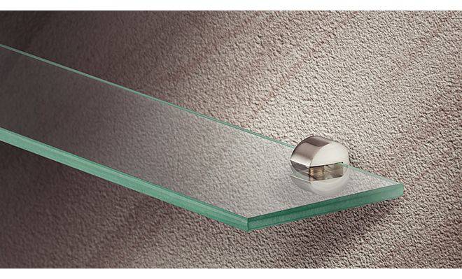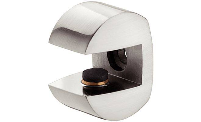 Дизайн-затискний полицетримач для дерева і скла, матеріал: цинкове лиття, кольору нержавіючої сталі, розмір: 22x23x29 мм, для полиць товщиною 8–10 мм, для вкручування в отвір діаметром 4 мм.