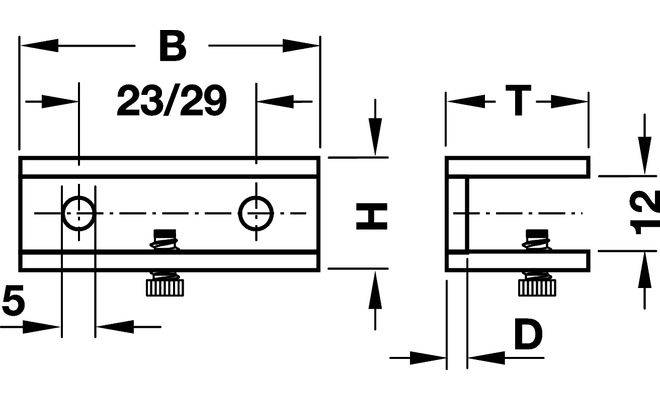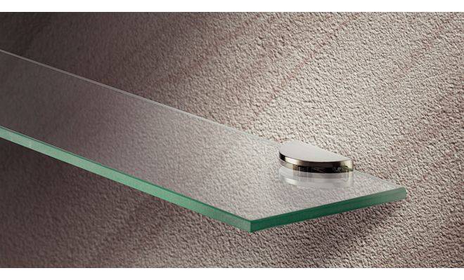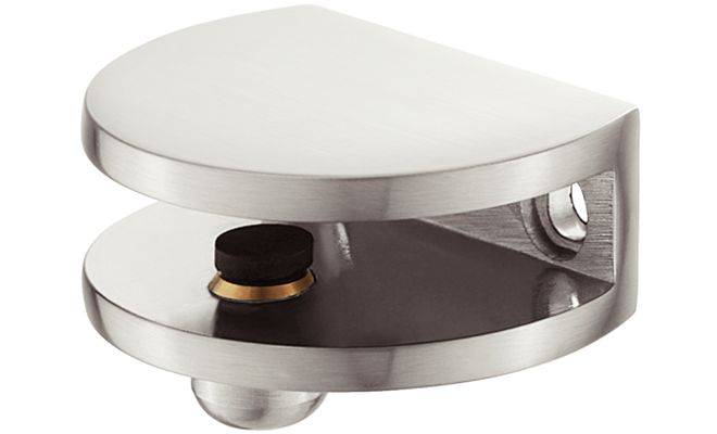 Дизайн-затискний полицетримач для дерева і скла, матеріал: цинкове лиття, кольору нержавіючої сталі, розмір: 47 x21 x18 мм, для полиць товщиною 8-10 мм, для вкручування в отвір діаметром 3.5 мм.
