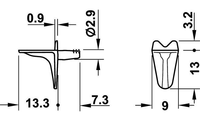 Полицетримач для дерев'яних полиць для кріплення в отворі діаметром 3 мм. Витримує навантаження до 9,4 кг.
