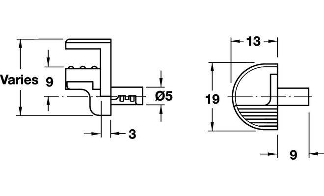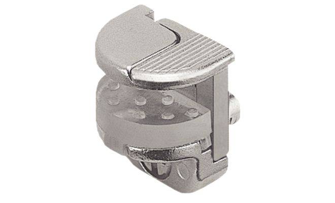 Полицетримач для скла, з фіксацією, матеріал: цинкове лиття з пластиковим фіксатором, нікельований, для полиць товщиною 6/8/10 мм, для втикання в свердловий отвір діаметром 5 мм, з двох частин, фіксуючий елемент тримає полицю в установленому положенні і запобігає перекиданню.