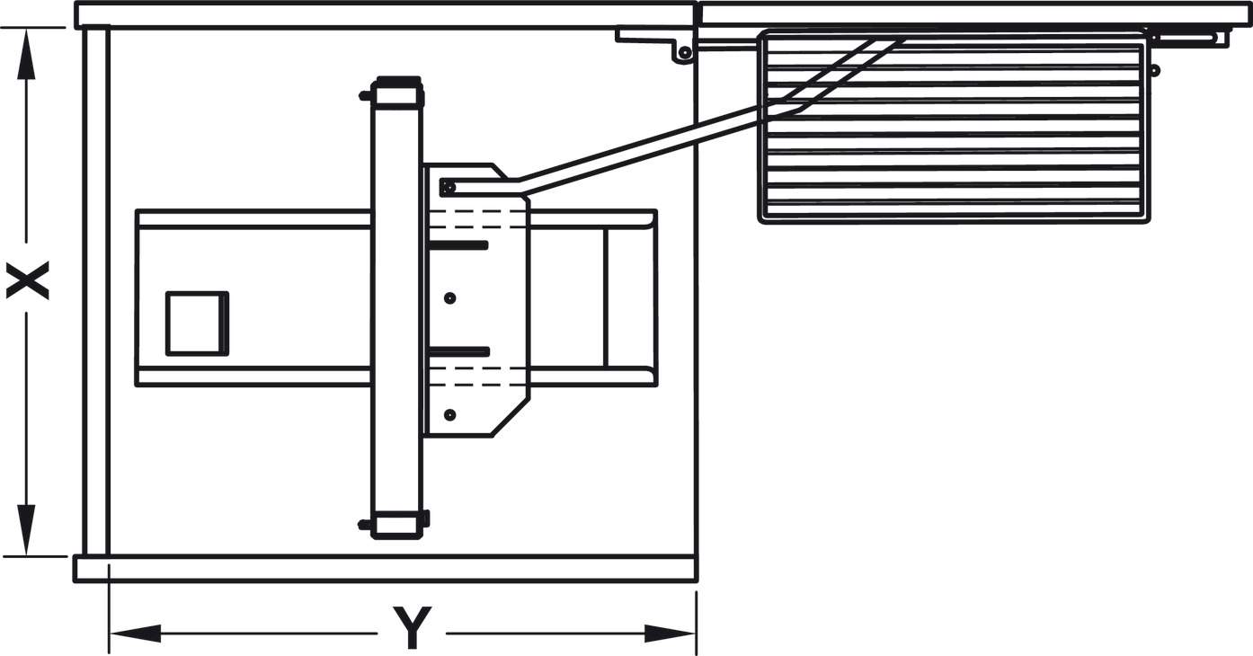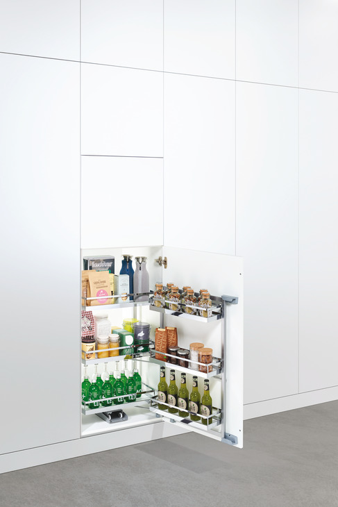 Внутрішній висувний механізм шафи з вмонтованим амортизатором, оснащений висувною рамою, дверною полицею з нековзким дном білого кольору і навісними, дротяними корзинами, призначений для монтажу за поворотними дверима. Несуча здатність висувної полиці 60 кг, дверної полиці 25 кг, ширина корпусу 600 мм, висота монтажу всередині корпусу 800 мм. Висувна рама виготовлена зі сталі з пластиковим покриттям кольору білий алюміній, дверна полиця і навісні корзини виготовлені з хромованої сталі. Рама призначена для лівого і правого використання.