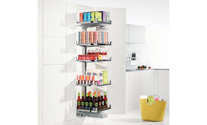 Комплект фурнітури повного висуву з полицями, з амортизатором і механізмом самозакривання, для встановлення за навісними дверима, правосторонній, матеріал: підвісний профіль і передні кронштейни: сталь, покрита пластиком, кольору білий алюміній/висувна фурнітура: сталь, кольору алюмінію/полиці: ДСП, білого кольору/скло, полиці з протиковзким покриттям, для ширини шафи 600 мм, для внутрішньої глибини шафи мін. 500 мм, для внутрішньої висоти шафи 2100-2200 мм, висота навісного профілю 1530 мм, максимальне навантаження 100 кг (20 кг/полиця), товщина бічних стінок 16 або 19 мм, кут 135°.