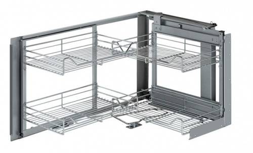 Поворотно-висувний комплект Magic Corner Style, для кутової тумби, з 4 дротяними корзинами, правоповоротний, двоповерховий, матеріал: сталь, для висоти корпуса мін. 525 мм, глибина корпуса мін. 485 мм, ширина корпуса 860-971 мм, максимальне навантаження 18 кг.