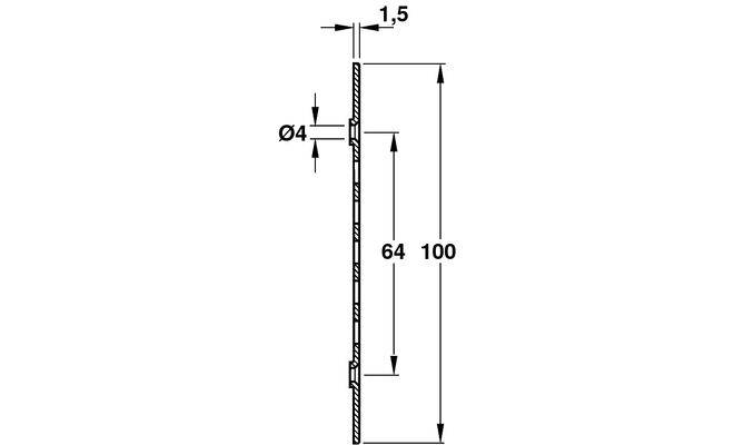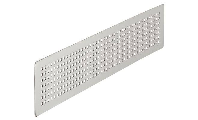 Прямокутна вентиляційна решітка з круглими отворами, виготовлена з нержавіючої сталі з крацованою поверхнею. Ширина решітки 100 мм, довжина 1000 мм, товщина 1,5 мм, розмір вирізу 965х85 мм, площа проходу 183,1 см². Монтаж решітки виконується шляхом пригвинчування шурупами Liko 3х16 мм.