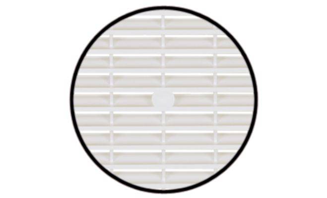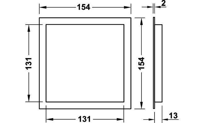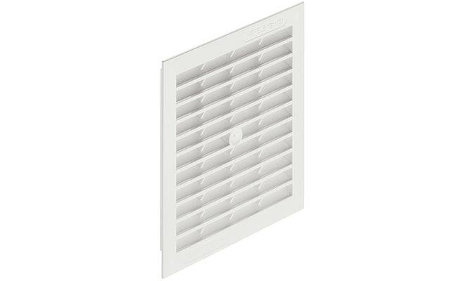 Квадратна вентиляційна решітка з ламелями та захисною кромкою. Вентиляційна решітка виготовлена з пластмаси білого кольору. Розмір решітки з урахуванням захисної кромки 154х154 мм, без кромки 131х131 мм, глибина решітки 13 мм, площа проходу 100 см². Монтаж решітки виконується шляхом врізання з можливістю пригвинчування.