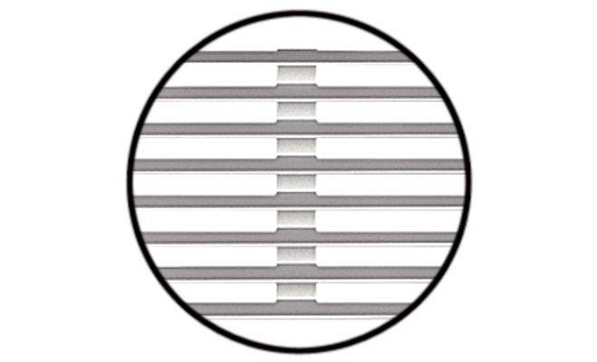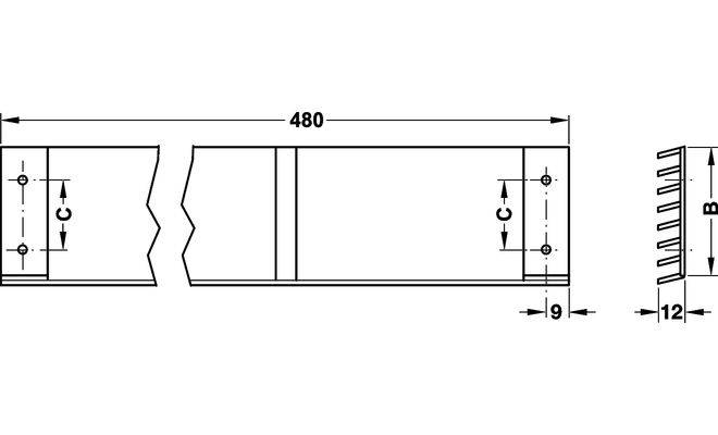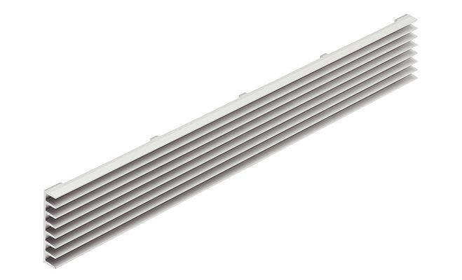 Прямокутна вентиляційна решітка з двома широкими зовнішніми перетинками та ламелями встановленими під нахилом. Вентиляційна решітка виготовлена з алюмінію з анодованою поверхнею сріблястого кольору. Висота решітки 56 мм, довжина 480 мм, ширина решітки 12 мм, площа проходу 147,0 см². Монтаж решітки виконується шляхом пригвинчування.