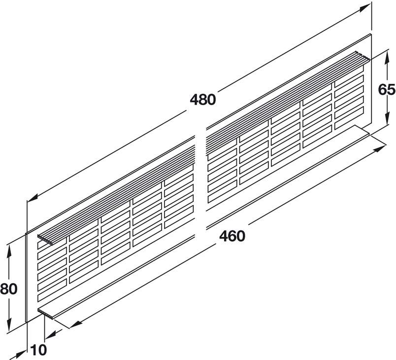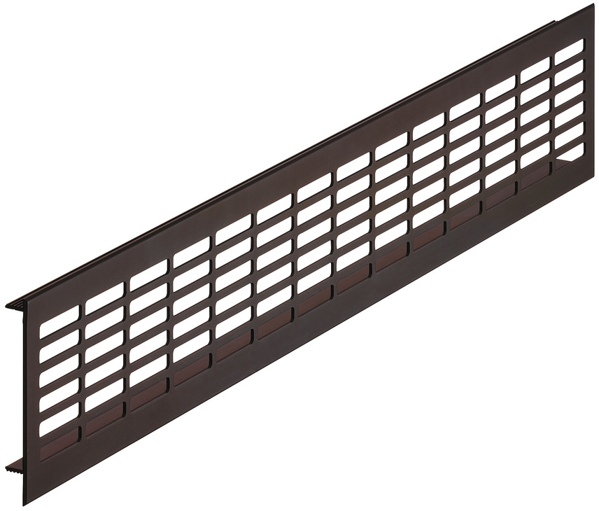 Прямокутна вентиляційна решітка з прорізями, рифленими перемичками та видимими кромками з фаскою. Вентиляційна решітка виготовлена з алюмінію з анодованою поверхнею темно-коричневого кольору. Висота решітки 80 мм, довжина 480 мм, товщина 1,5 мм, розмір вирізу 460х65 мм, площа проходу 150,4 см². Монтаж решітки виконується шляхом запресовування.