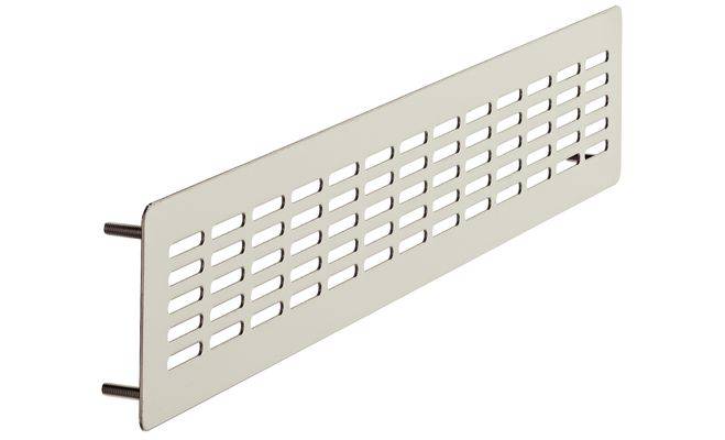 Вентиляційна решітка прямокутної форми з прорізами, заокругленими кутами та різьбовими гвинтами у якості фіксаторів. Вентиляційна решітка виготовлена з нержавіючої сталі з матовою, крацованою поверхнею. Ширина решітки 100 мм, довжина 500 мм, товщина 1,5 мм, розмір свердлінн (відстань між отворами) 81 мм, площа проходу 131,5 см². Монтаж вентиляційної решітки виконується шляхом вставлення.