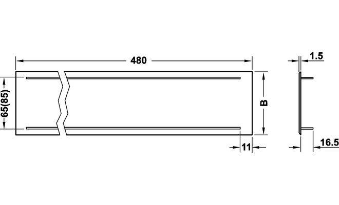 Прямокутна вентиляційна решітка з прорізами 20 х 3 мм та скошеними видимими кромками, виготовлена з алюмінію з пластиковою поверхнею білого кольору. Висота решітки 80 мм, довжина 480 мм, товщина 1,5 мм, розмір отвору для решітки 458х65 мм, площа проходу 100,2 см². Монтаж решітки виконується шляхом запресовування.