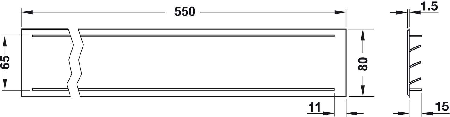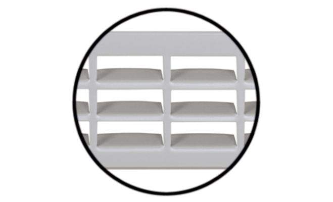 Прямокутна вентиляційна з ламелями, рифленими перемичками та видимими кромками з фаскою. Вентиляційна решітка виготовлена з алюмінію з анодованою поверхнею сріблястого кольору. Ширина решітки 80 мм, довжина 550 мм, товщина 1,5 мм, розмір вирізу 528х64 мм, площа проходу 200 см². Монтаж решітки виконується шляхом запресовування.