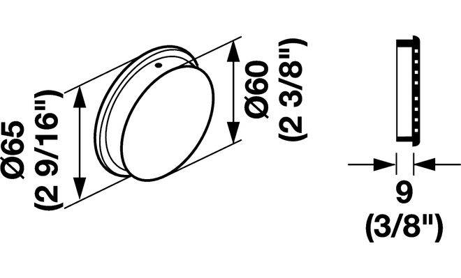 Вентиляційна решітка, кругла, з захисною кромкою, матеріал: пластмаса, колір: білий, діаметр з кромкою 65 мм, діаметр без кромки 60 мм, товщина кромки 2 мм, глибина решітки 9 мм, для монтажу шляхом врізання.
