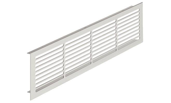 Прямокутна вентиляційна решітка з прорізами та гладкими перемичками, виготовлена з алюмінію з анодованою поверхнею сріблястого кольору. Ширина решітки 86 мм, довжина 400 мм, товщина 1,7 мм, розмір вирізу 370х72 мм, площа проходу 160 см². Монтаж решітки виконується шляхом врізання, кріплення шляхом пригвинчування. Вентиляційна решітка відповідає вимогам фірм-виробників холодильників.