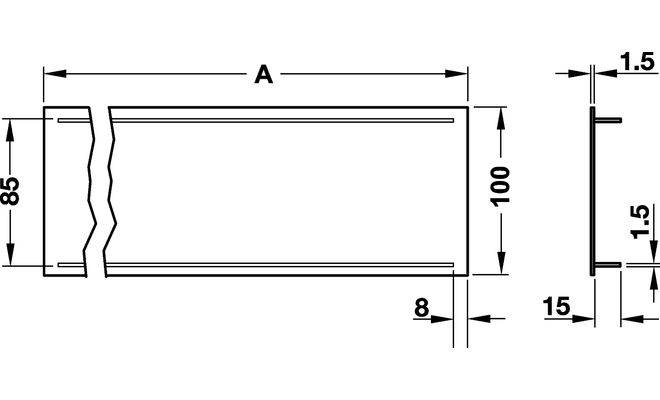 Прямокутна вентиляційна решітка з перфорацією та рифленими перемичками. Вентиляційна решітка виготовлена з алюмінію з анодованою поверхнею сріблястого кольору. Ширина решітки 100 мм, довжина 2000 мм, товщина 1,5 мм, розмір вирізу 1985х85 мм, площа проходу 370,4 см². Монтаж решітки виконується шляхом запресовування.