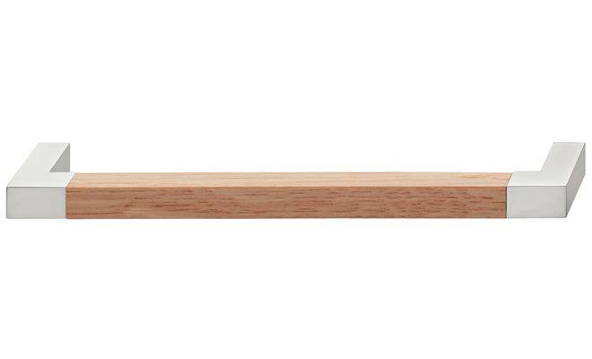 Меблева ручка-скоба для дерев'яних дверей. Виготовлена з дубового дерева з лакованою поверхнею. Основа ручки виготовлена з цинкового сплаву цамак, хромована з матовою поверхнею.