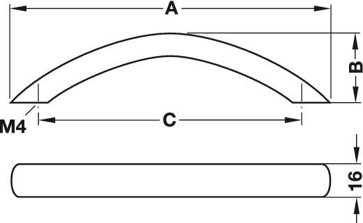 Ручка виготовлена з алюмінію з матовою поверхнею, довжина може бути наступна: 151,227,262 мм. Тип ручки - дуга, колір - сріблястий. Застосовується для меблів з деревини. Є три варіанти товару, які подібні між собою за матеріалом, кольором та поверхнею. Завдяки своєму кольору і матеріалу, Ручка чудово підходить до багатьох меблевих виробів.