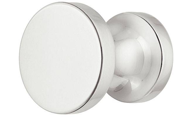 Меблева ручка-кнопка круглої форми, для дерев'яних дверей. Виготовлена з хромованаої латуні з полірованою поверхнею.