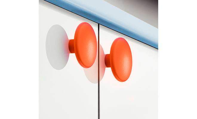 Меблева ручка-кнопка овальної форми для дерев'яних дверей. Виготовлена з пластмаси помаранчевого кольору.