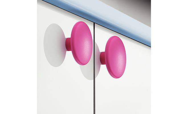 Меблева ручка-кнопка овальної форми для дерев'яних дверей. Виготовлена з пластмаси рожевого кольору.