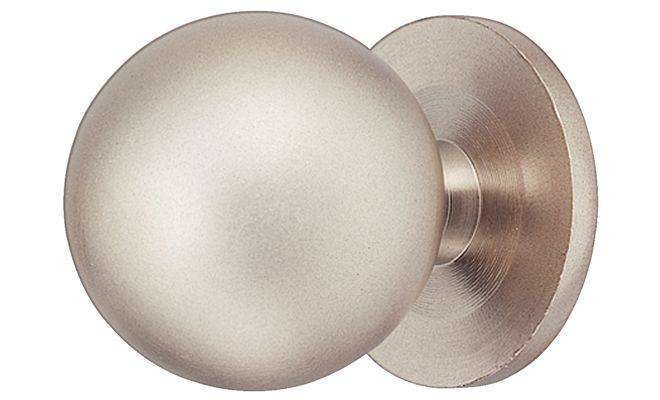 Меблева ручка-кнопка у формі кулі, для дерев'яних дверей. Виготовлена з латуні, нікельована з матовою поверхнею.