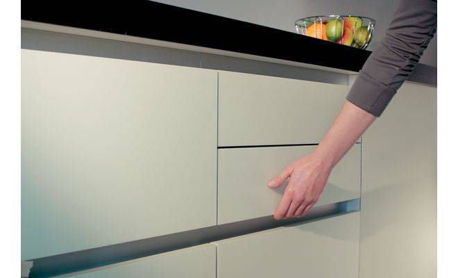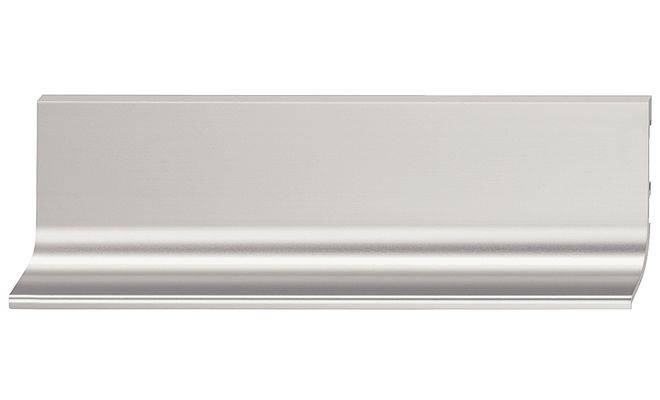Профільна ручка-планка для лицевих панелей без ручок, для монтажу між робочою плитою та розташованою під нею лицевою панелю. Виготовлена з алюмінію з анодованою поверхнею. Колір поверхні ручки: нержавіюча сталь.