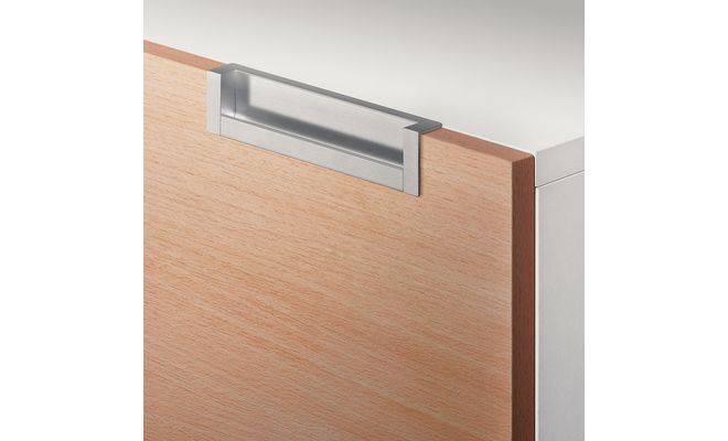 Меблева врізна ручка для дерев'яних дверей. Виготовлена з алюмінію, заглушки ручки виготовлені з цинкового сплаву цамак з поверхнею сріблястого кольору.