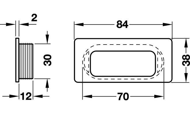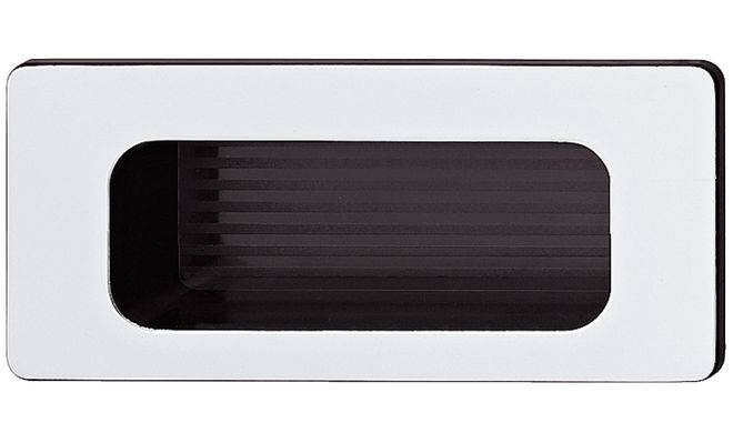 Меблева врізна ручка для дерев'яних дверей. Виготовлена з пластмаси з матовою поверхнею сріблястого кольору, внутрішня частина ручки чорного кольору. Ручка кріпиться без гвинтів за допомогою клеєвих канавок.