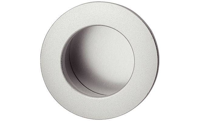 Меблева врізна ручка круглої форми для дерев'яних дверей. Виготовлена з алюмінію з анодованою поверхнею сріблястого кольору. Ручка кріпиться без застосування гвинтів за допомогою клеєвих канавок.