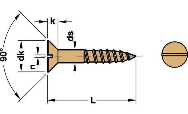 Шуруп з потайною головкою, DIN 97, з неповною різбою, виготовлений з латуні. Параметри шурупа (мм): діаметр різьби/довжина/діаметр головки/висота головки/привід - 4,0/30/7,5/2,2/ прямий шліц товщиною 1,0 мм.